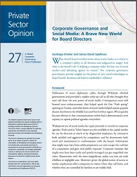 Private Sector Opinion 27: What should board members know about social media as it relates to a company’s ability to do business and safeguard its image? And what is the board’s role in helping a company make the best use of social media -and defending against its misuse? Two corporate governance practitioners provide insights on the power of new social technologies to shape boards’ decisions and bolster stakeholders’ influence.