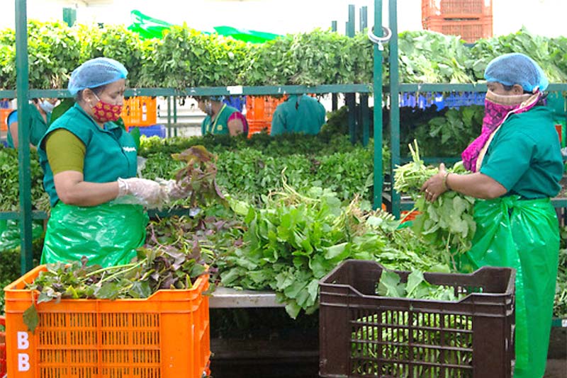 Gowramma (l) and Manju Bai (r) packages green leafy vegetables inside a Big Basket distribution center in Hoskote, on the outskirts of Bengaluru, India. ©IFC/Jdot Productions 2021