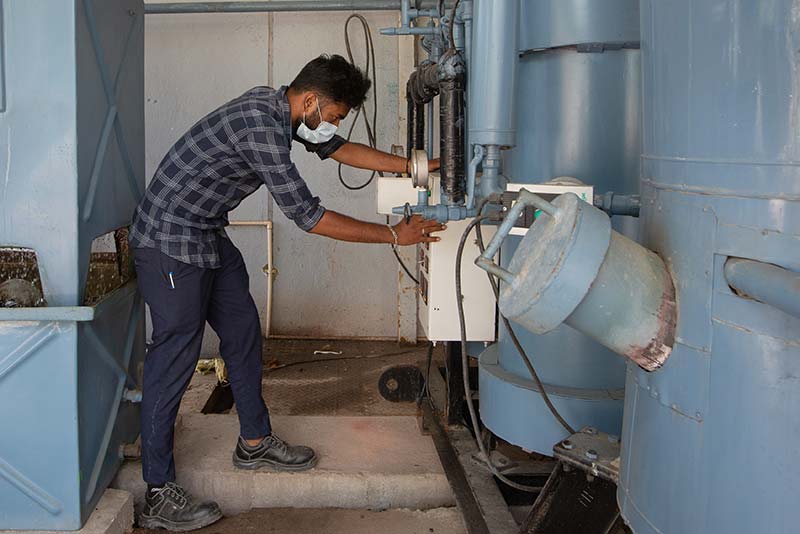 Prateek R monitors pilot equipment at a BigBasket distribution center in Hoskote, near Bengaluru, India. © IFC/Jdot Productions 2021