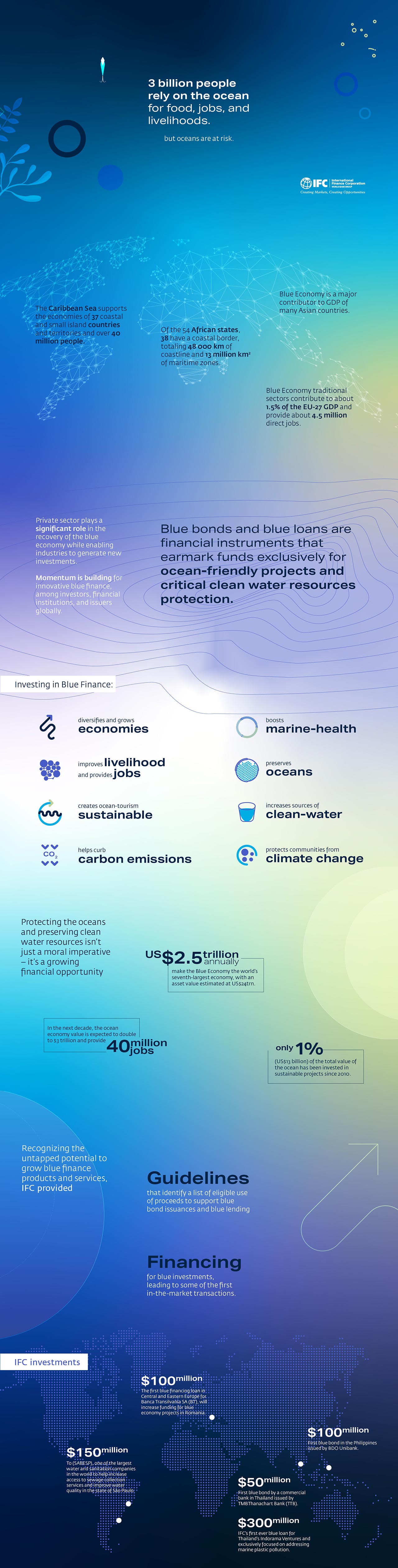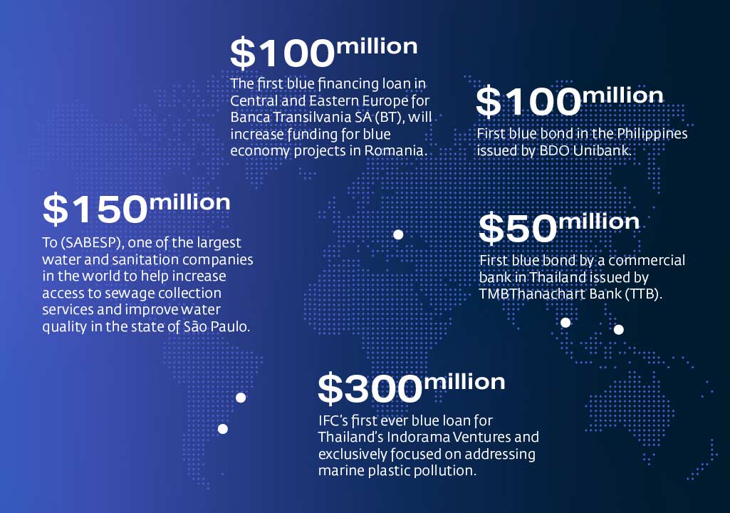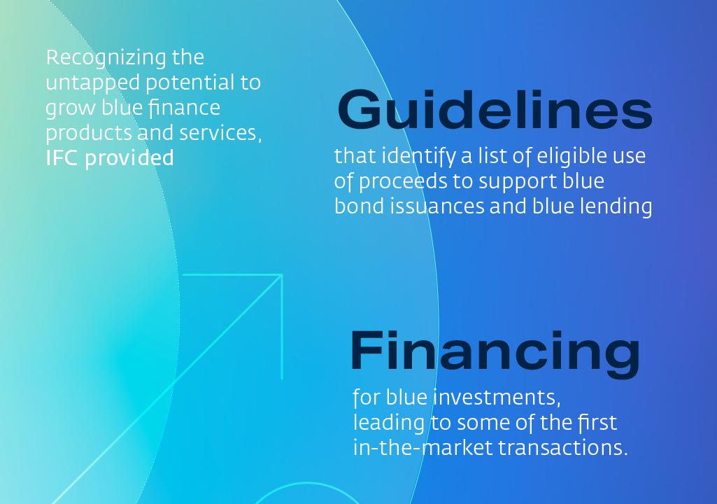 IFC has been spearheading market standards and working to grow a viable global blue finance market. In February 2022, IFC was the first to develop Guidelines for Blue Finance to help guide investments in the blue economy and earmark vital eligible ocean-compatible projects. Since 2020, IFC has provided and mobilized more than $700 million in blue loans and bonds to private sector financial institutions and corporations, including: