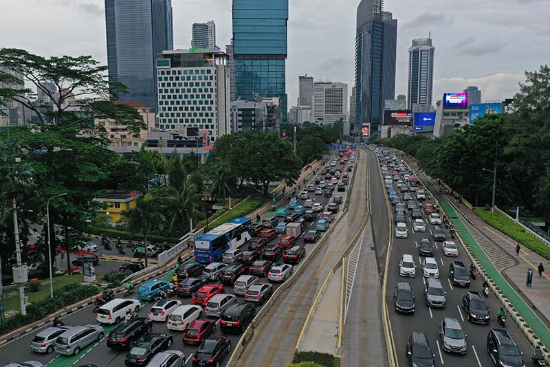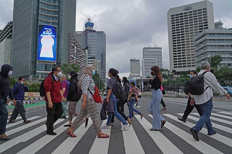 Commuters at a pedestrian crossing in the central business district of Jakarta, Indonesia. Photo by Dimas Ardian