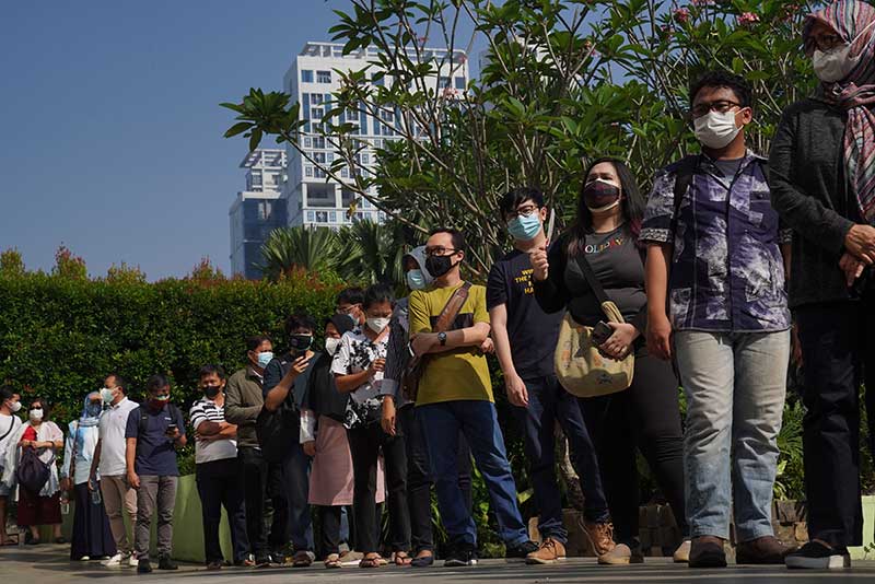 In Banten, Indonesia, people wait in line to receive the COVID-19 vaccine. Photo by Dimas Ardian
