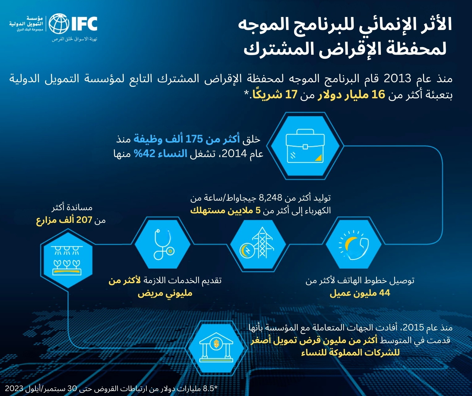 وبالنسبة للقروض التي تم الارتباط بها حتى 30 سبتمبر/أيلول 2023 وقيمتها 8.5 مليارات دولار، قامت المؤسسة بجمع البيانات، على النحو الوارد في استقصائنا السنوي للجهات المتعاملة مع المؤسسة، التي تظهر الأثر الإنمائي للتمويل المقدم من البرنامج إلى جانب برامج التمويل وبرامج الخدمات الاستشارية التي تقدمها المؤسسة لحسابها الخاص، وذلك على النحو التالي: