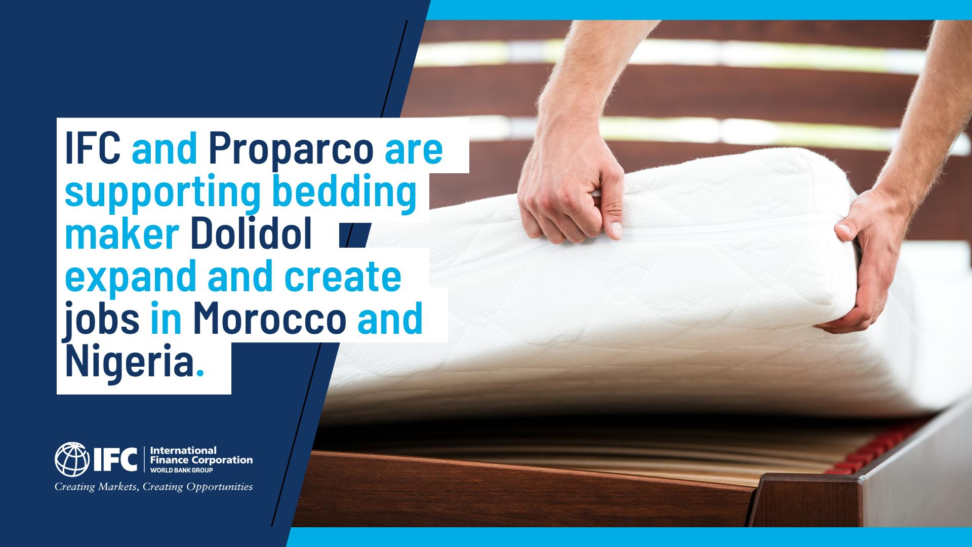IFC's €20 million financing package includes a loan of €13.5 million from IFC's own account and €6.5 million mobilized from Proparco, the French Development Institution. The financing will support Dolidol's entry into Nigeria, where it plans to purchase Mouka, the country's leading mattress and bedding supplier. Dolidol will also strengthen its distribution network in Nigeria and improve the quantity and quality of bedding products available there. IFC's financing package will be accompanied by advisory services to improve productivity.