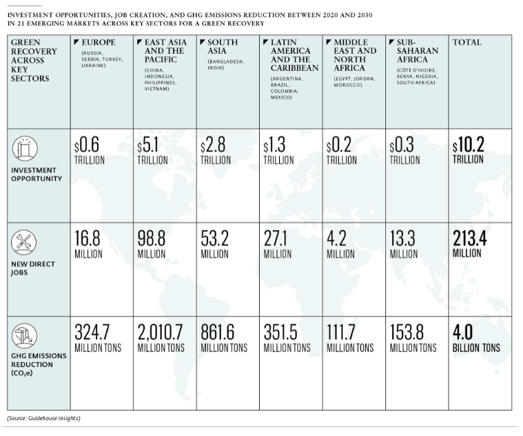The report highlights how investment in ten sectors through post-COVID recovery efforts can help to support deliver economic recovery, create jobs, and help achieve the goal of limiting global temperature rise to below 2 degrees Celsius.