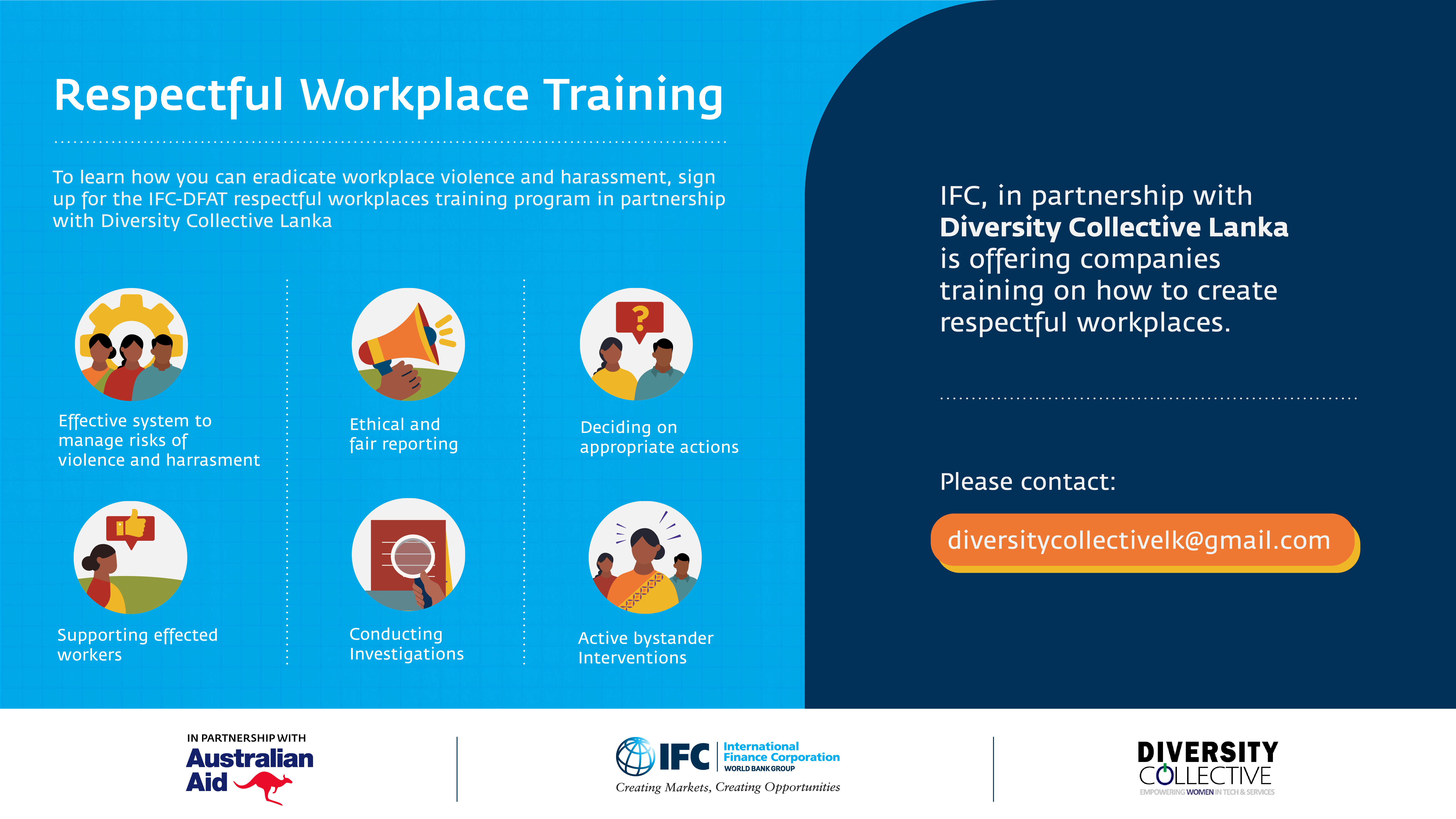 In Sri Lanka, IFC has also developed a policy and toolkit to help the country's private sector address workplace violence and harassment. For more information on the IFC-DFAT Respectful Workplaces training, delivered in partnership with Diversity Collective Lanka, contact diversitycollectivelk@gmail.com
