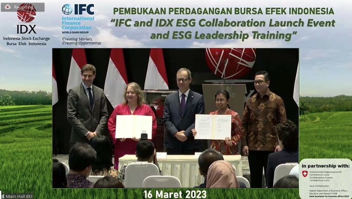 Under a memorandum of understanding (MoU) announced today between the IDX, International Finance Corporation (IFC), a member of the World Bank Group, and with the support from Swiss State Secretariat for Economic Affairs (SECO), listed companies and prospective listers will be encouraged to strengthen Environmental, Social and Governance (ESG) practices. The move is expected to boost the companies' efforts to better weigh ESG issues, including climate-related risks, and help them deliver on sustainability goals. This collaboration had a commencement through the opening bell ceremony for "IFC and IDX ESG Collaboration Launch Event and ESG Leadership Training" held today, Thursday (16/3) in the Main Hall of IDX, Jakarta, Indonesia.