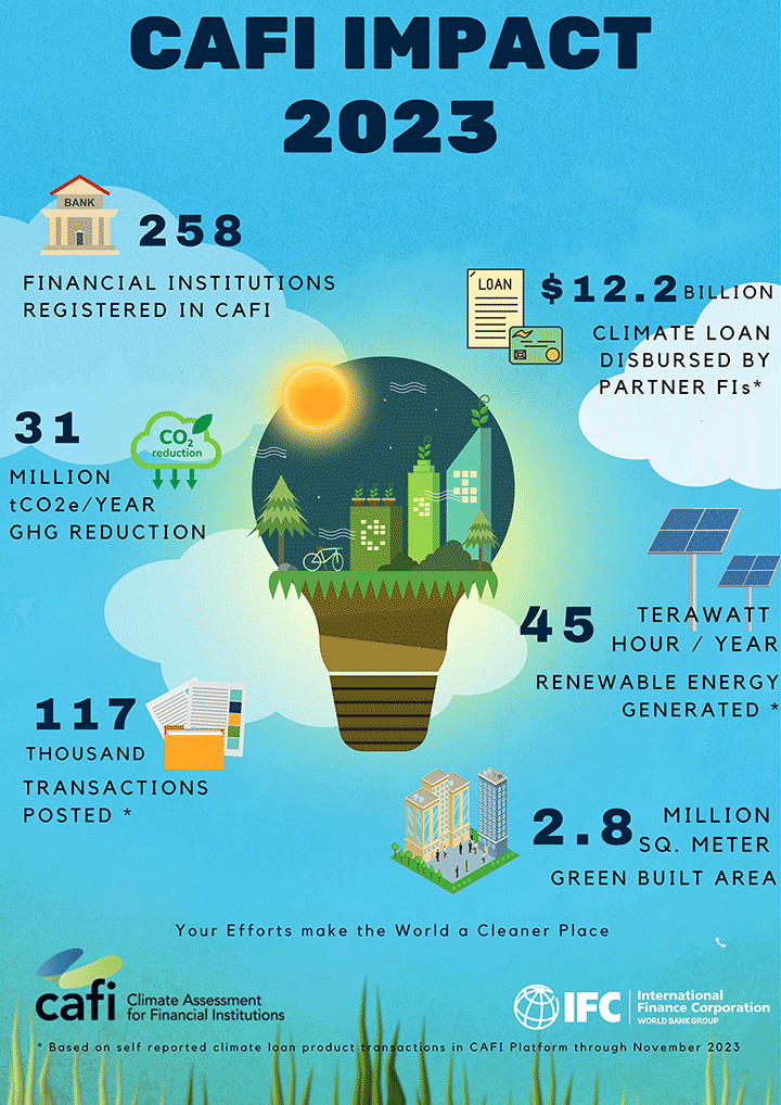 As of June 2023, IFC has committed $15.2 billion to climate related projects through more than 210 emerging market financial institution partners, leveraging an additional $5.8 billion. The CAFI tool allows these partners to assess the climate eligibility and climate impact of investments they make.