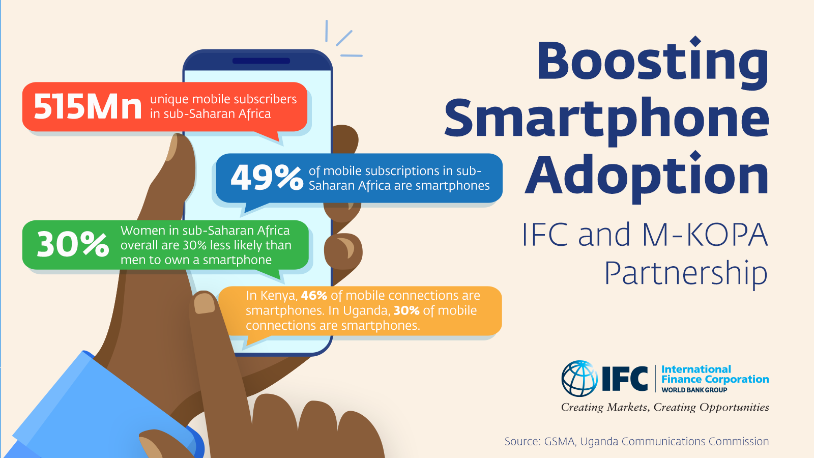 Less than half of Kenyans and only a third of Ugandans with a mobile phone have a smartphone, according to data from industry group GSMA and the Ugandan Communications Authority. The gap is even greater for women, where GSMA estimates that women in sub-Saharan Africa overall are 30 percent less likely than men to own a smartphone. Key to the IFC loan will be helping to bridge the smartphone gap in Kenya and Uganda by making affordable finance available to more people.