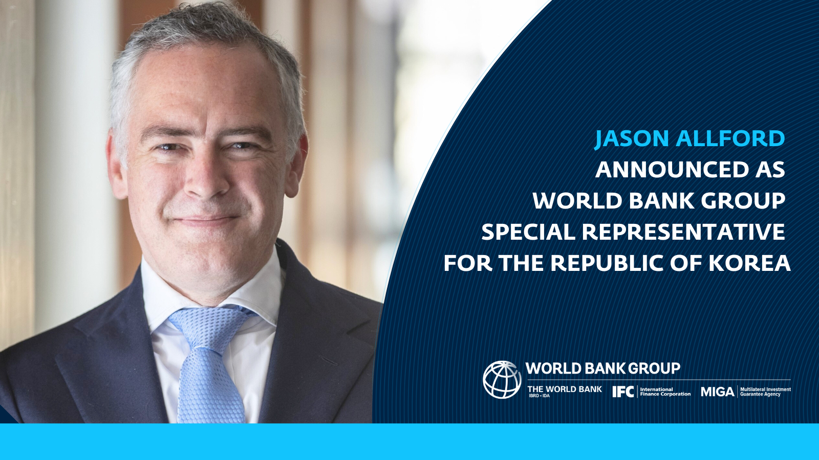Seoul, July 1, 2024 – Starting today, Jason Allford becomes the World Bank Group Special Representative for the Republic of Korea, a position that will unify country-level leadership across the institution to better support Korea's public and private sector priorities. This newly created position provides a single point of contact for access to the full breadth of World Bank Group products and services and will enhance the institutions' ability to address global challenges, and drive development with speed, efficiency, and impact.