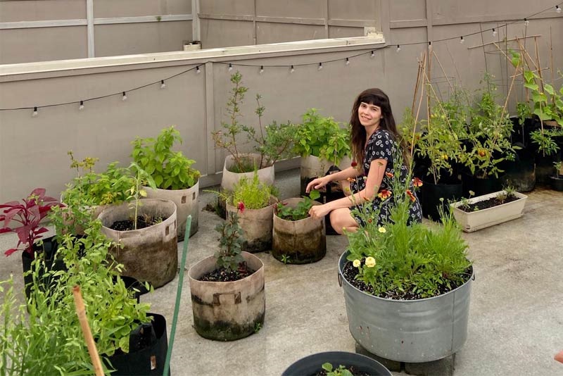 Photo: Maria López Conde tending to a strawberry plant in her rooftop garden at the height of summer in DC. Credit: Marina Lopez Conde
