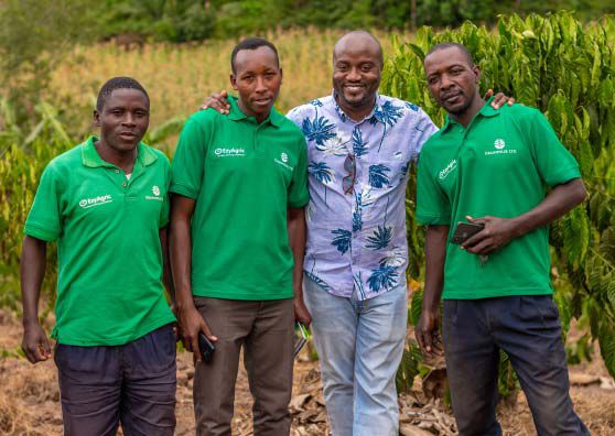 Nathan Were, with Grainpulse extension agents at one of the coffee demonstration farms in the Mityana District in Uganda. Photo: Namanya Dennis