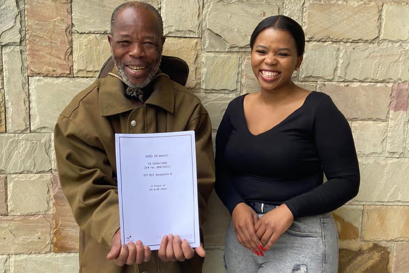 Sifunda Amos Nkosi (left) from iLembe district was happy to receive his title deeds.
