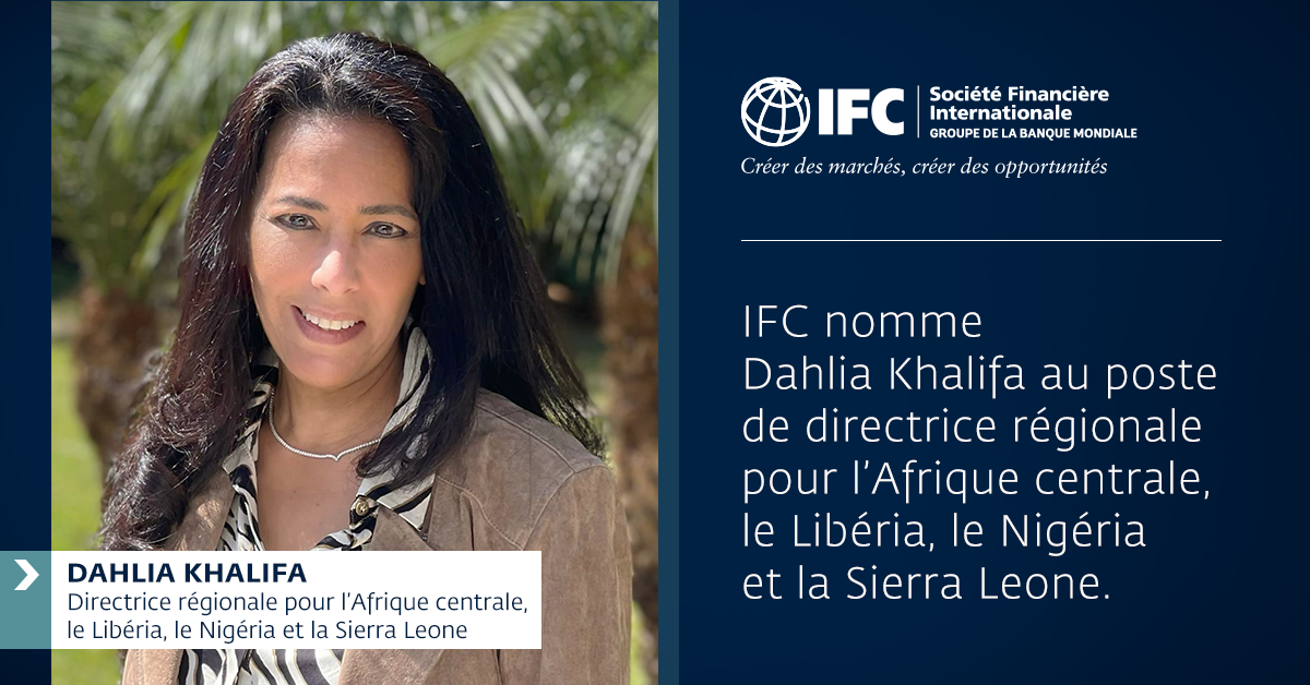 Mme Khalifa dirigera les équipes d'IFC chargées des investissements et des services-conseils au Cameroun, en République centrafricaine, au Tchad, en République du Congo, en Guinée équatoriale, au Gabon, au Libéria, au Nigéria, à Sao Tomé-et-Principe et en Sierra Leone. Alors que ces pays sont confrontés à des défis tels que la hausse de l'inflation et les effets du changement climatique, leur population jeune et entreprenante est un atout pour créer un secteur privé plus dynamique.
