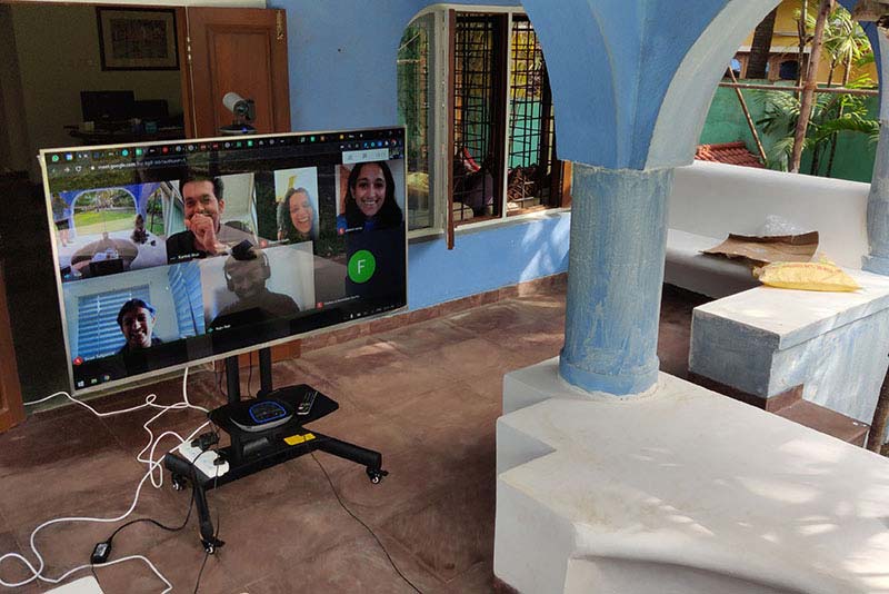 L'équipe build3 en visioconférence avec ses principaux conseillers, dans les locaux de la société à Goa. Photo : Nikit Gupta