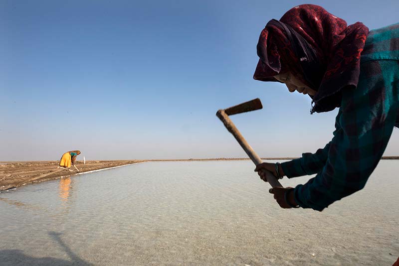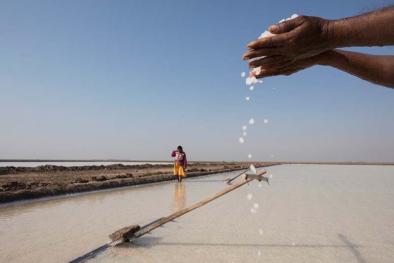 アガリヤの大半が女性であり、彼女たちがまとう色鮮やかなサリーや、スパンコールが散りばめられたサルワール・カミーズが、地割れした殺風景な地面に美しく映える。ここに集まった家族は、麻袋やビニールシート、竹竿から簡易な家を作り、9月から4月まで働く。仕事は過酷だ。まず塩水を地下から汲み上げるための井戸を掘る。手作業で土を堀りおこし、浅い長方形の塩田を作る。灼熱の太陽の下でゆっくりと塩水を蒸発させ塩を集める。その後、塩田を熊手のような道具で大きな塩の結晶になるまで耕し続け、それを彼女たちが手で集める。