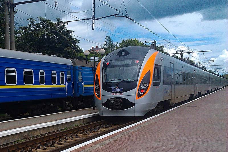 Пасажирські потяги в Трускавці, курортному місті на заході України. Нові пасажирські потяги (праворуч) виробництва Південної Кореї були введені в експлуатацію у 2012 році.